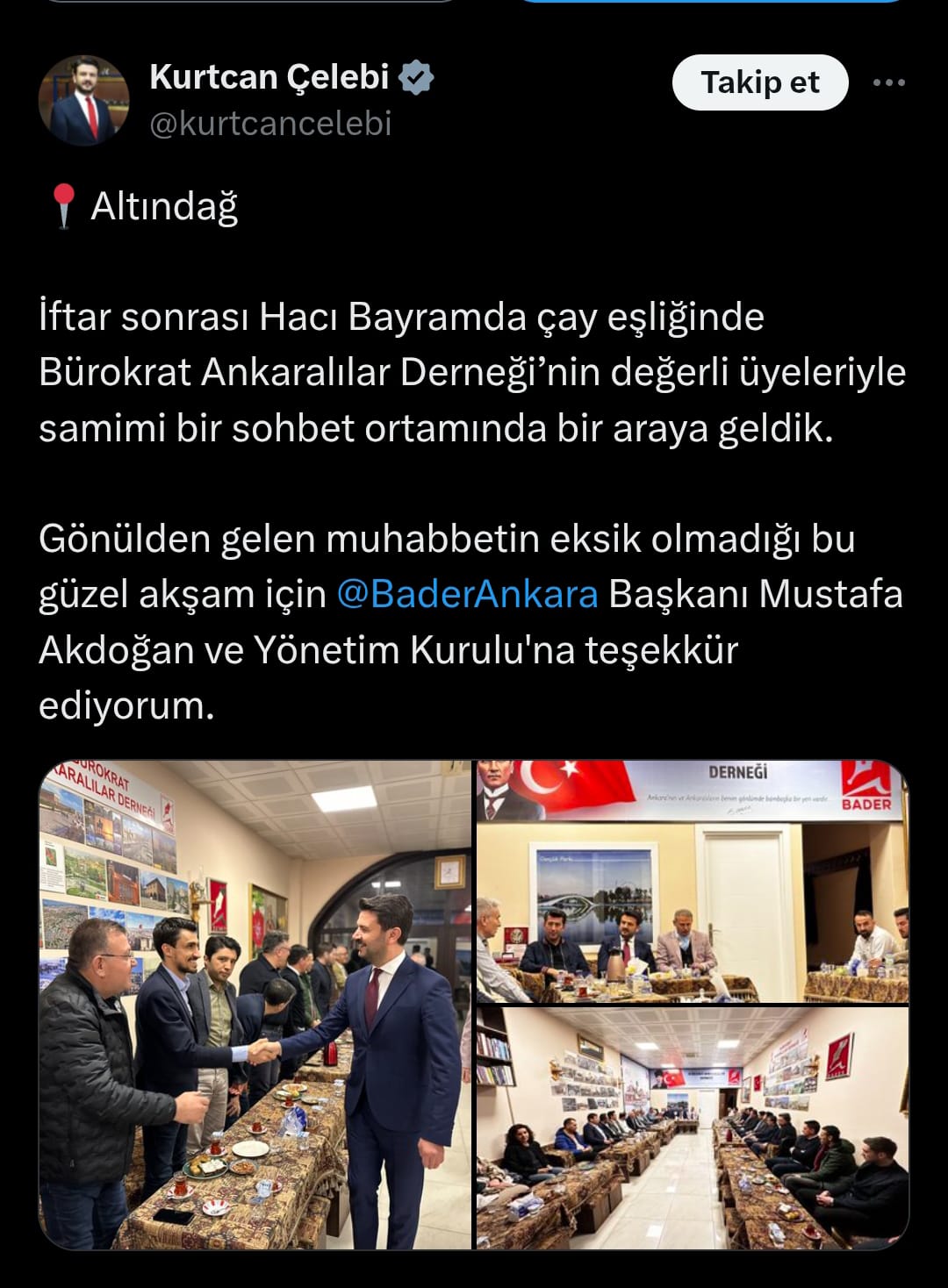 Ramazan sohbetlerimizin bu haftaki konukları hemşehrilerimiz; Ak Parti Ankara Milletvekili Kurtcan ÇELEBİ ve Siyasetçi/İş Adamı Ali GÜVEN ile çok sayıda hemşehrimizle birlikte Ankara özelinde güzel bir sohbet gerçekleştirdik. Başta Vekilimiz ve Başkanımız olmak üzere tüm hemşehrilerimize samimi içten sohbetleri için çok teşekkür ediyoruz.